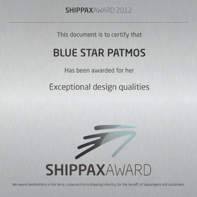 On April 2013, during the annual Shippax Ferry Shipping Conference that took place in Rotterdam, RoPax Blue Star Patmos was honored with two awards: one for the overall design of the ship, and one for the outstanding aesthetics of its areas. The award ceremony was hosted by the premier Swedish publishing house "Shippax Information", that specializes in providing the most extensive and up-to-date information, regarding passenger shipping internationally.