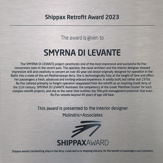 RoPax Smyrna di Levante of Levante Ferries was awarded the Shippax Award 2023, for "Best Retrofit". The award ceremony was held on board Grimaldi Cruise Barcelona, on April 24, 2023, during the Shippax Ferry Shipping Conference.