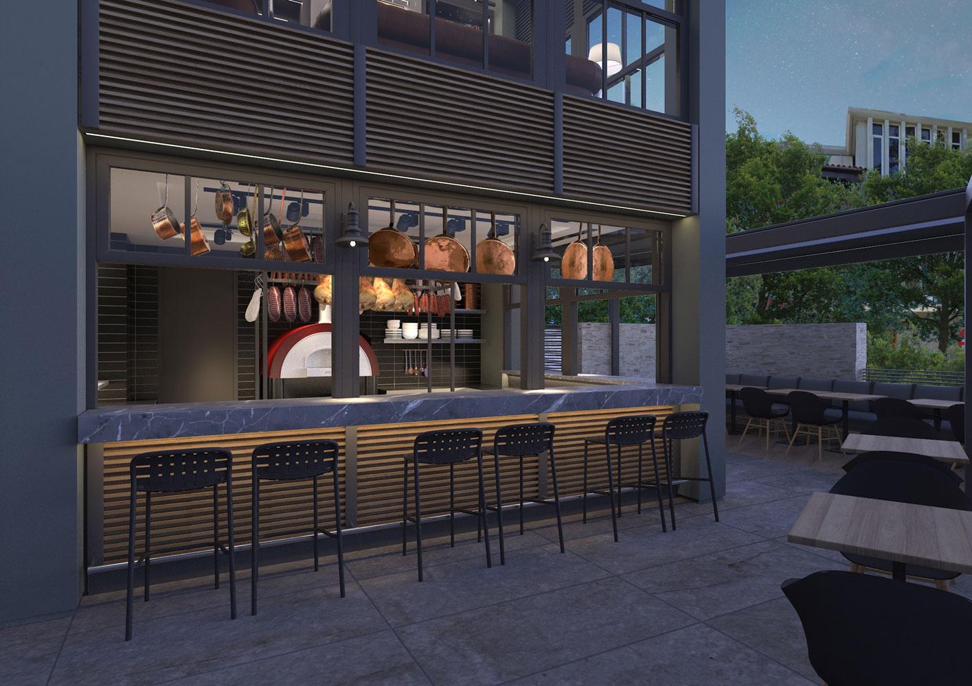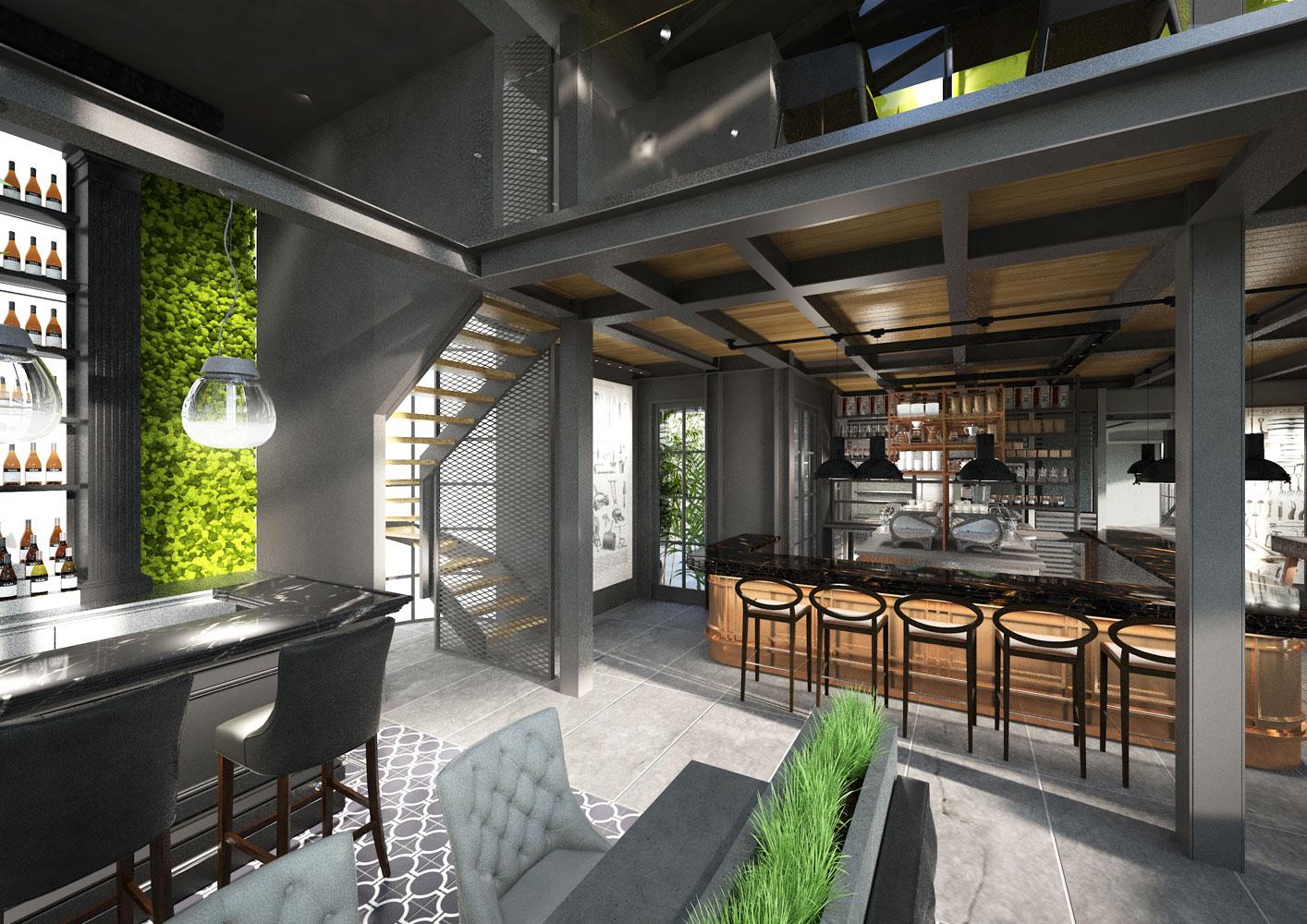 We designed a new, lightweight, double-story metal structure, reminiscent of a greenhouse and adjacent to the existing building. Blends comprises of many “neighborhoods”: from the double-height bar area, which is organized around the olive tree/trademark of Blends, the copper-colored coffee corner and the private cigar lounge on the upper level, to the exterior bar and tapas corner at the garden, every corner is designed to offer a different experience.