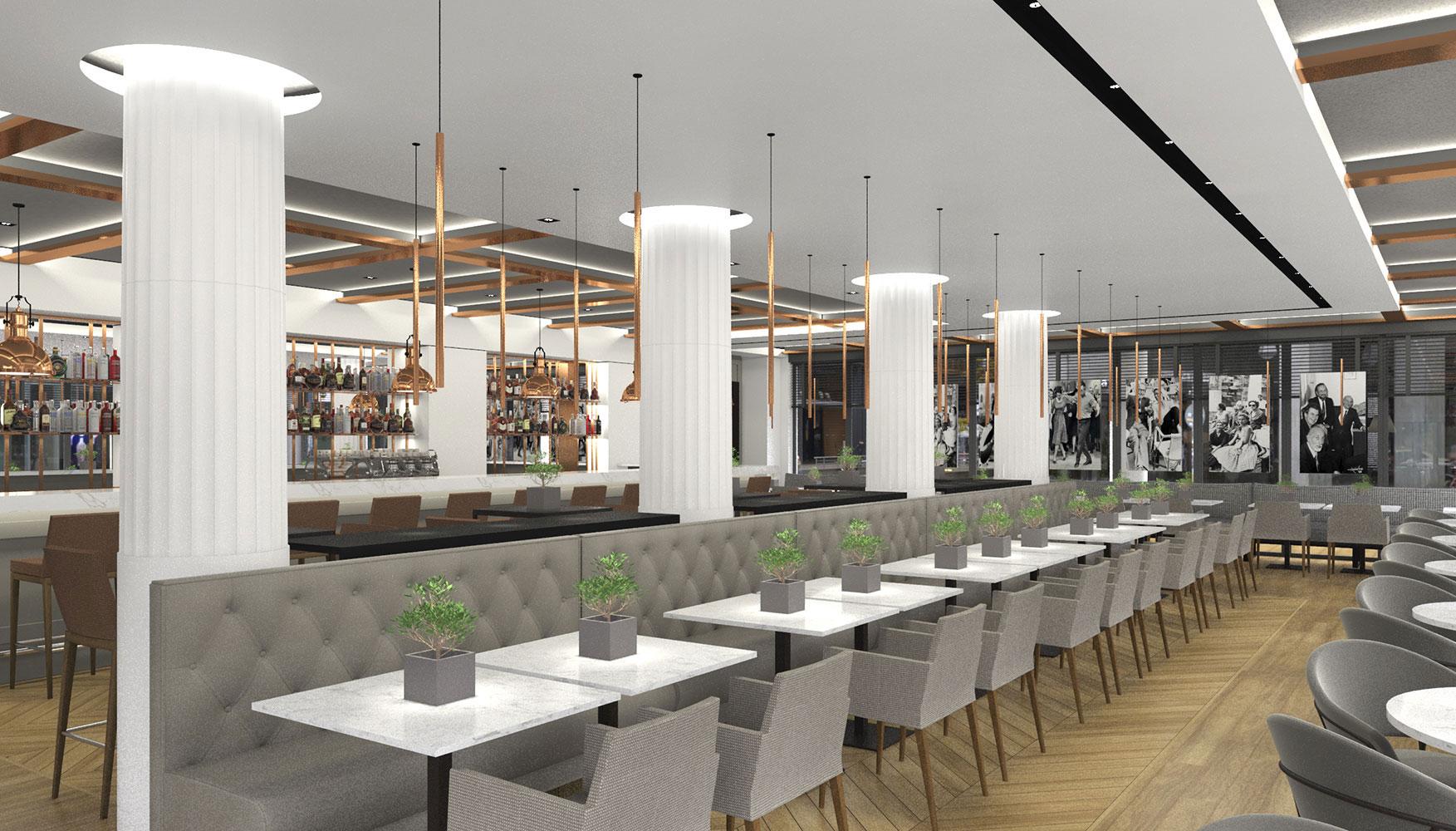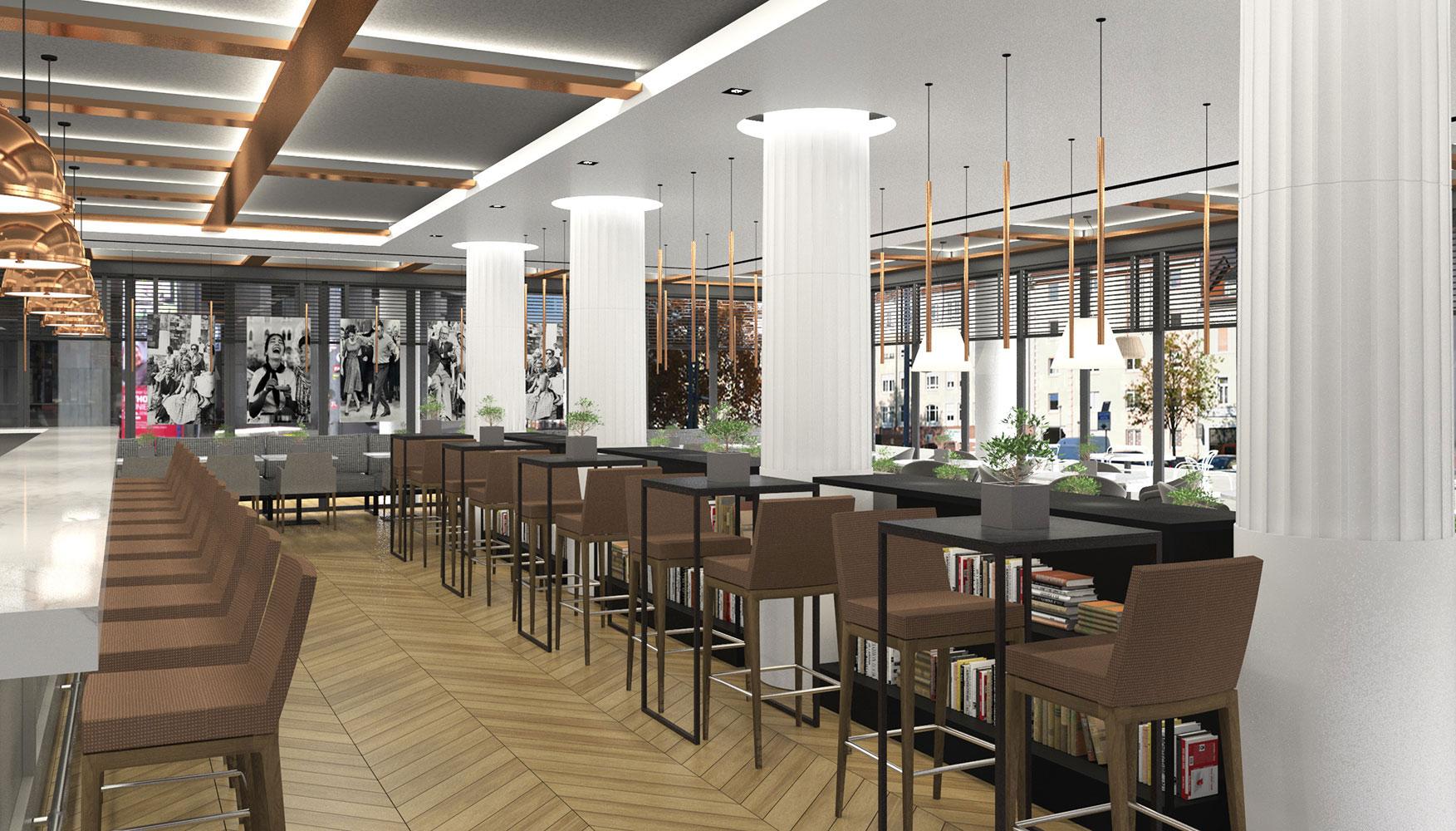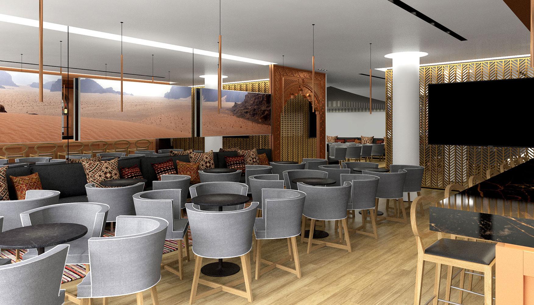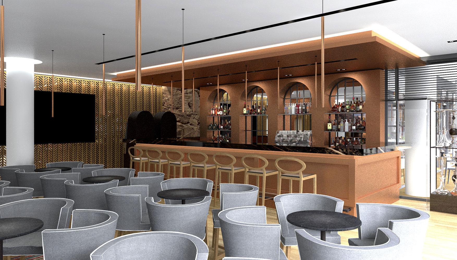 In Frankfurt, Germany, we designed the renovation of a large ground-level space. The entrepreneurs, a group of friends and second-generation Greeks who live in Germany, asked for two separate entertainment spaces, an all-day café/bar/restaurant, with a Greek theme, and a smaller shisha bar with inspiration from the East. The larger area also functions as a live music event space, so there is a possibility to modify the whole layout, even to empty the space completely. For the shisha bar, our inspiration was the landscape of Wadi Rum desert.