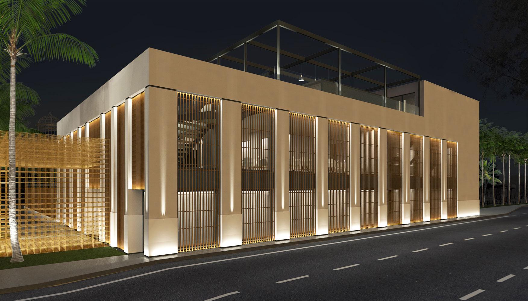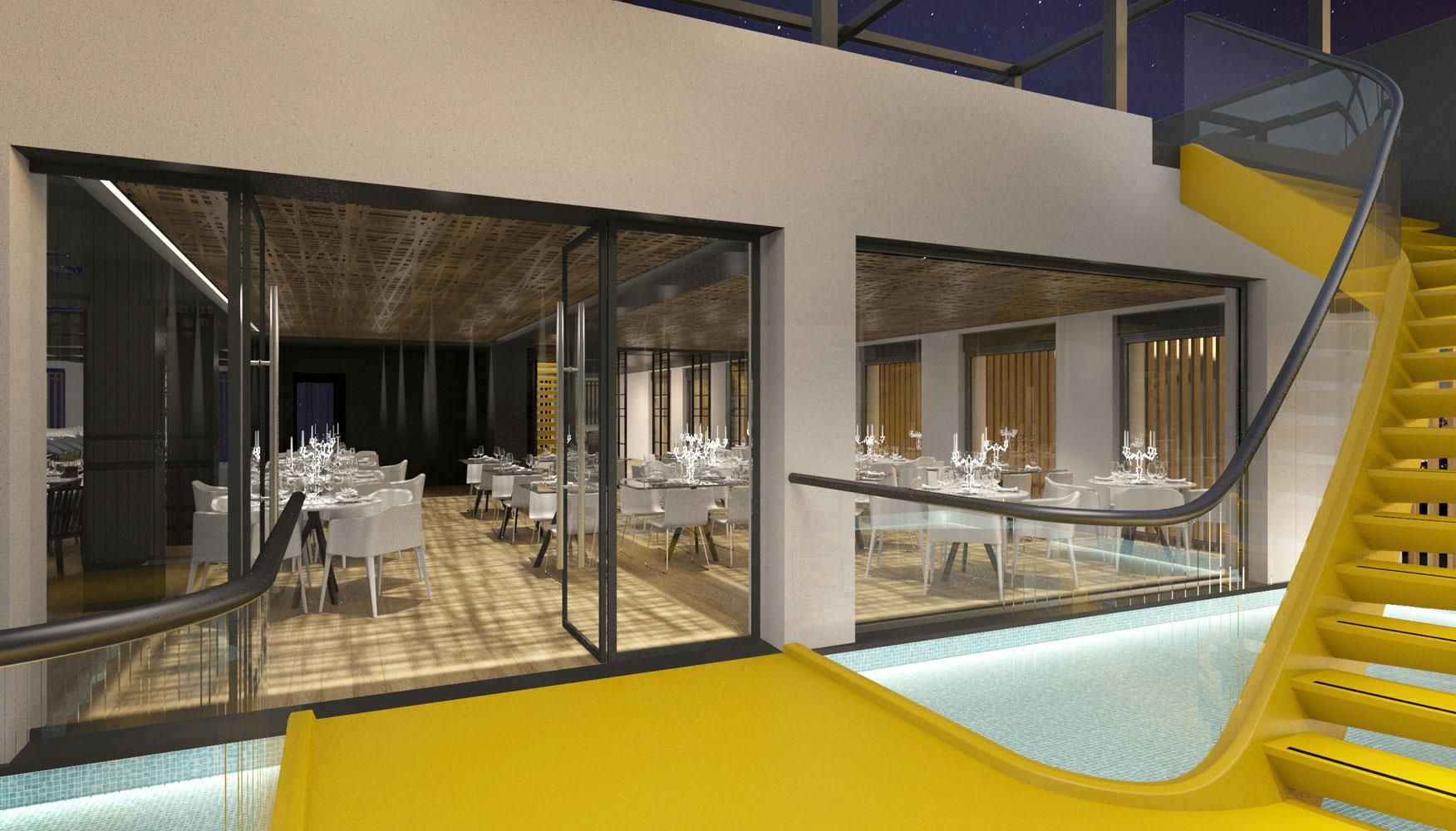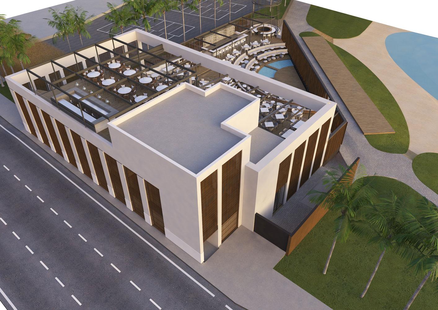 The second time, we designed a complex comprising of a fine dining restaurant on the first floor, a café/bar at the ground level, and an open-air space that would offer many possibilities for alternative entertainment.