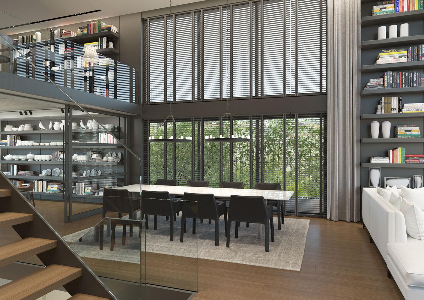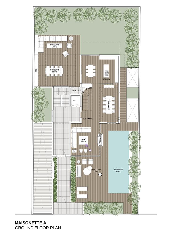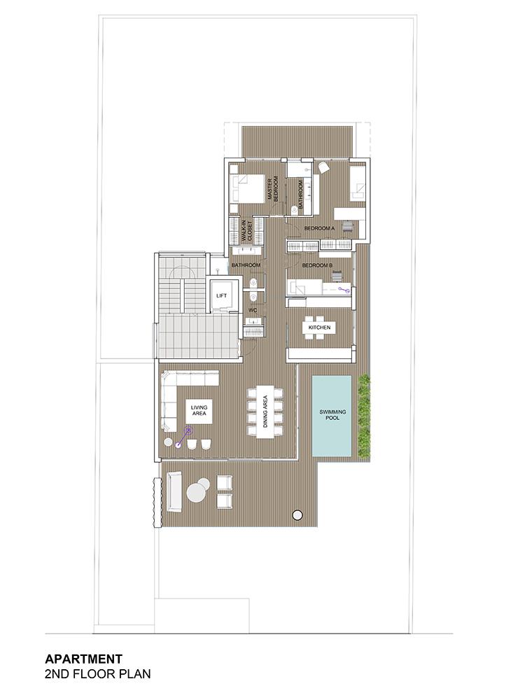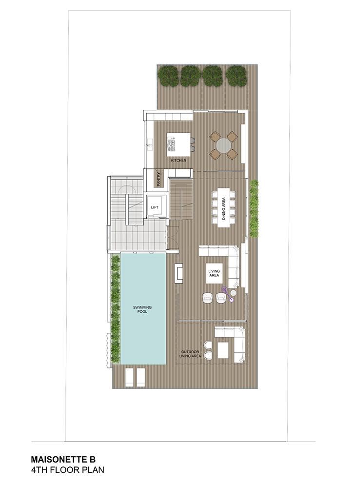 The owner of the plot asked us to design a residential building with a maisonette with a swimming pool at the top floors of the building that would serve as her own residence.