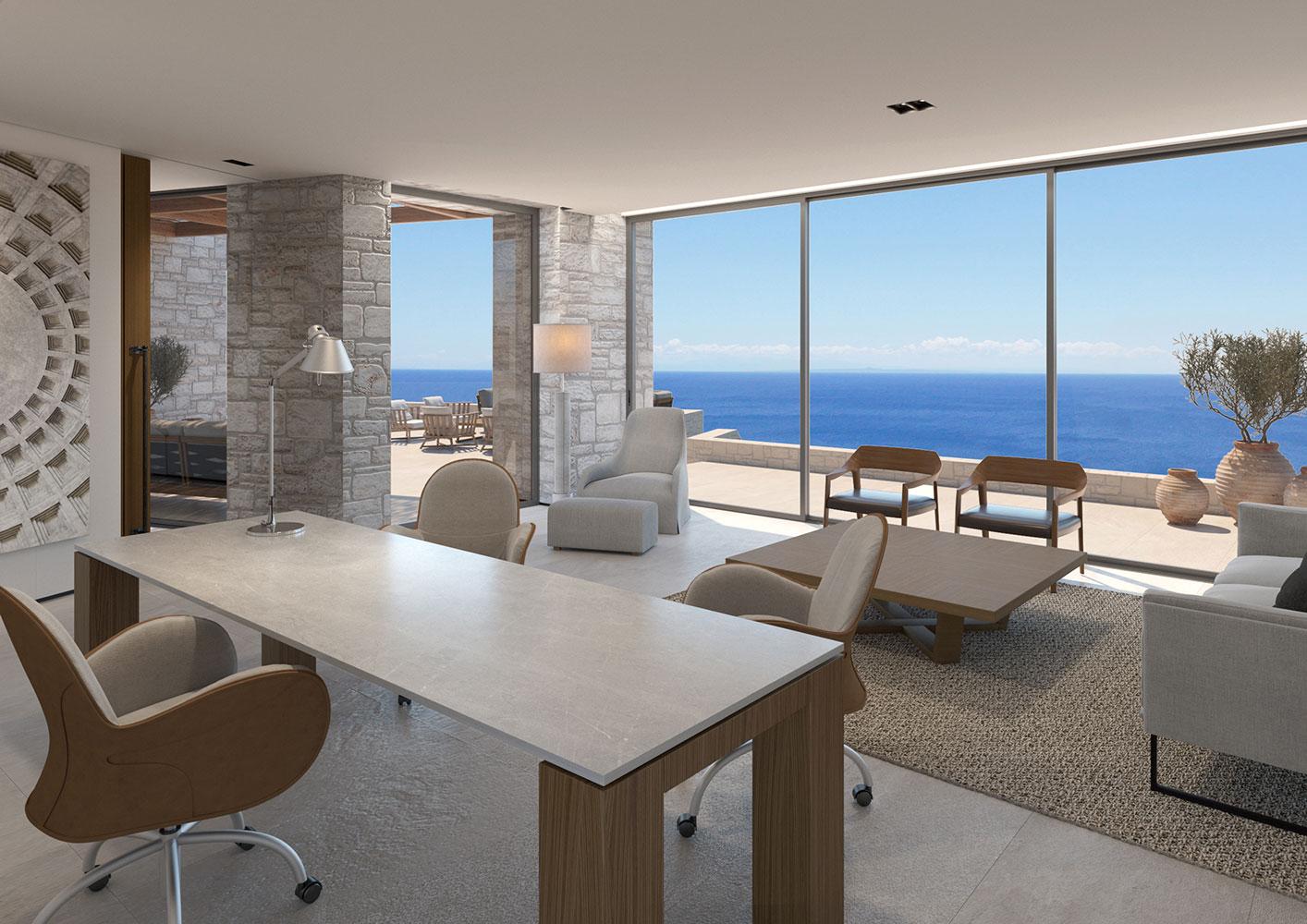 With that in mind, we proposed to have the common areas at the top level of the building, with a large semi-open dining room, protected by the north winds, an infinity pool and a large study.