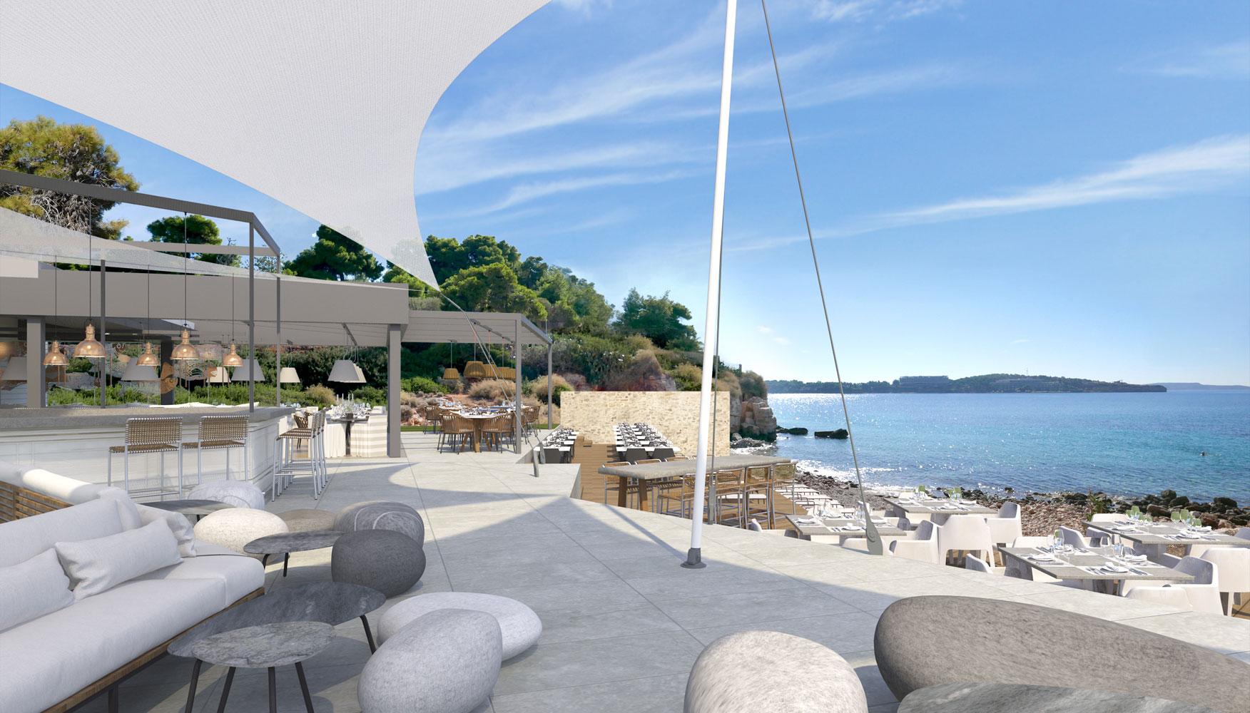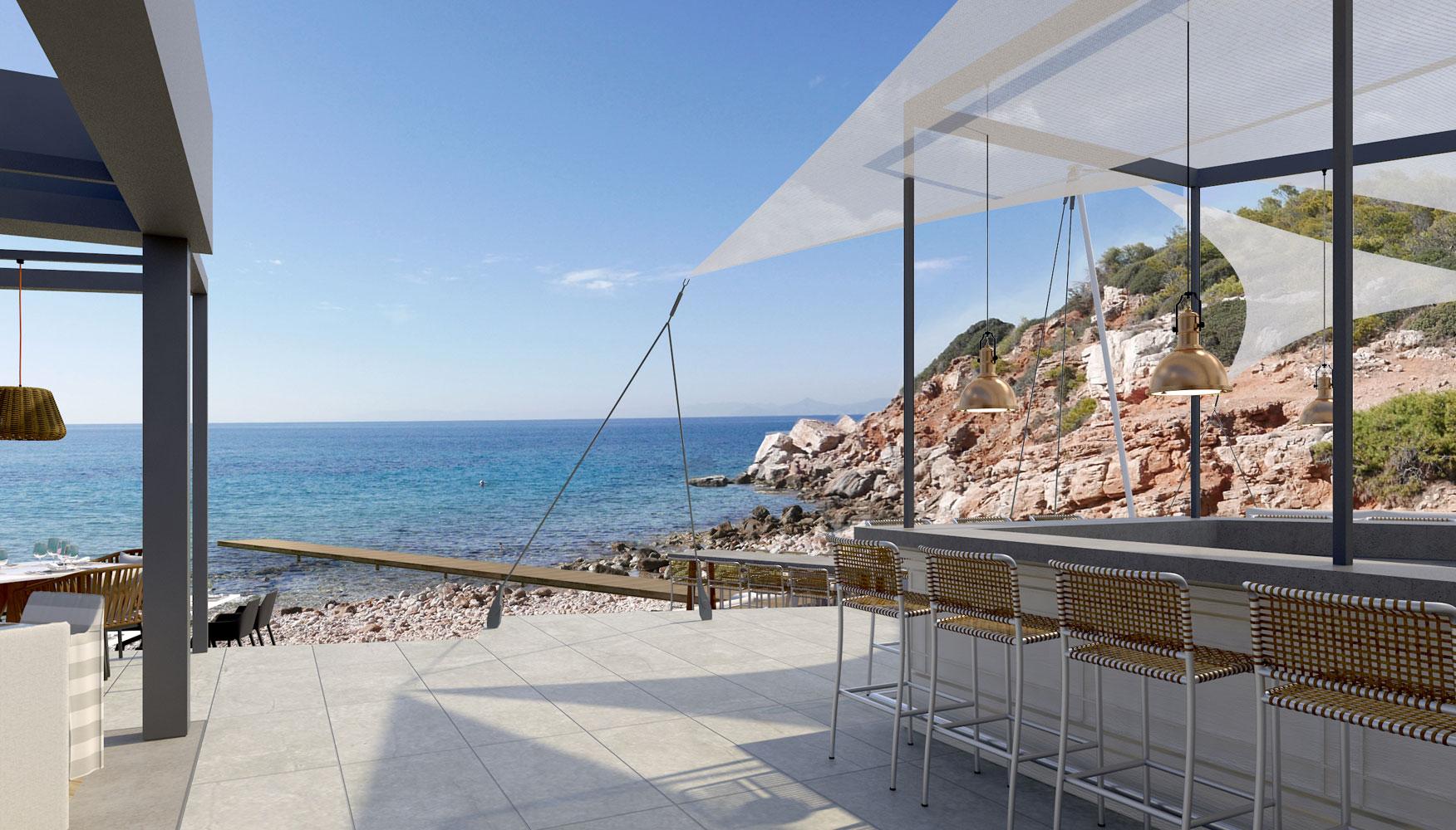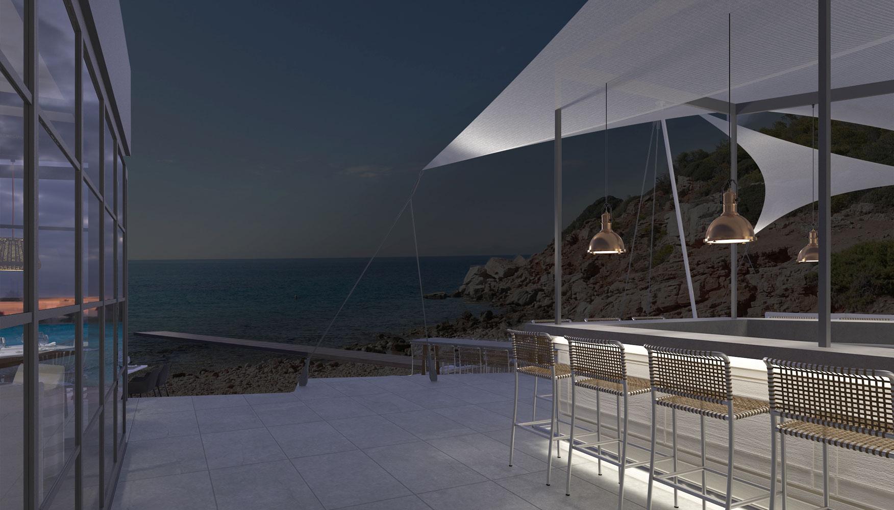 In a small but beautiful and secluded bay in Kavouri, our team designed a proposal for an all-day café/bar/restaurant, with a unique view of the Vouliagmeni bay. The shell of an existing municipal kiosk is transformed and extended towards the sea with amphitheatrically placed wooden deck levels, and a long wooden pier. The scenography is completed with the atmospheric night lighting, that underlines the different levels.