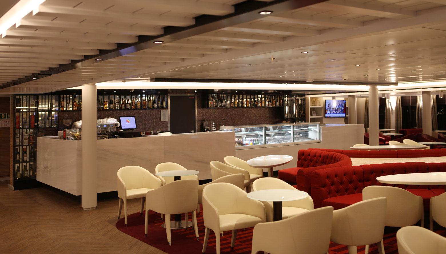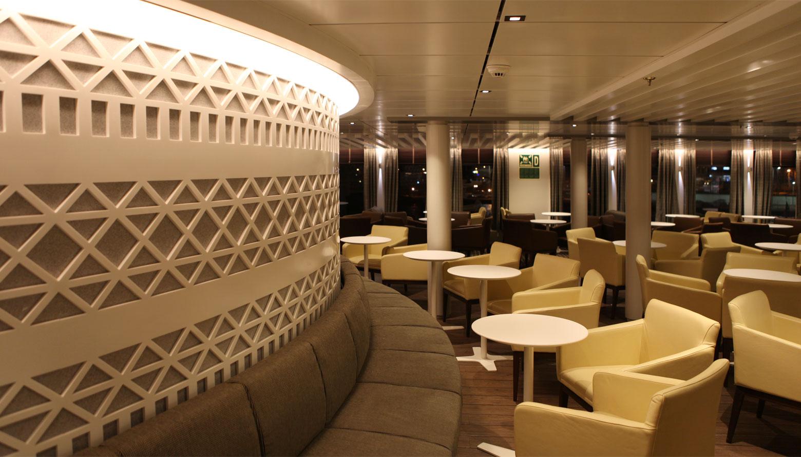 The main idea was to incorporate elements of the Greek islands she visits, to the ferry’s interior. We designed a wooden pergola ceiling for “Mykonos Lounge”, among bougainvilleas and windmills. For “Tinos Lounge” we were inspired by the island’s characteristic pigeon house patterns, with references to the local marble craftsmen. “Andros Lounge”, is dedicated to our clients’ island of origin.