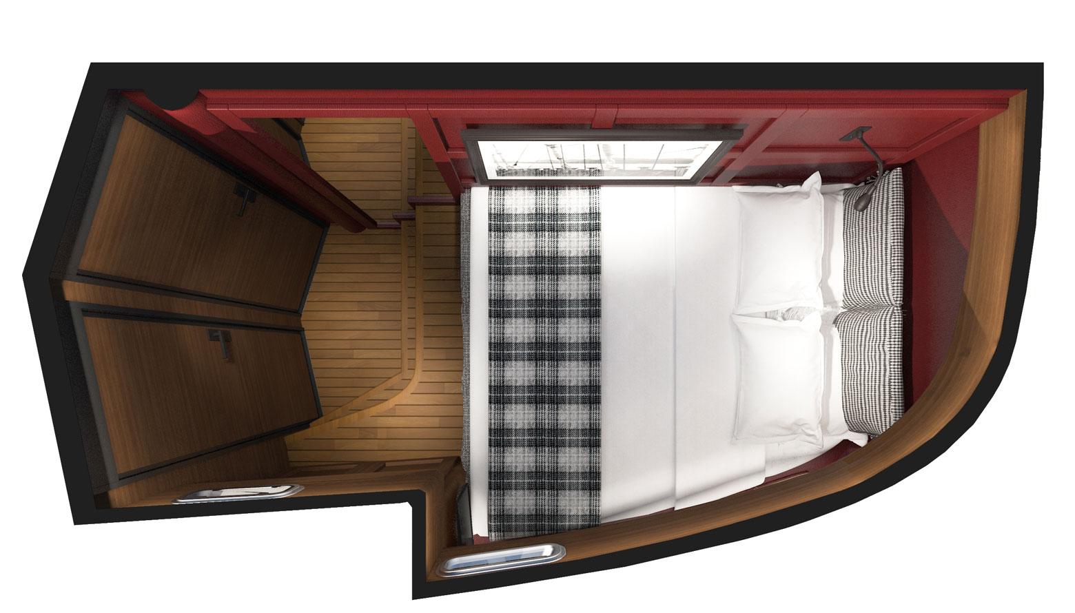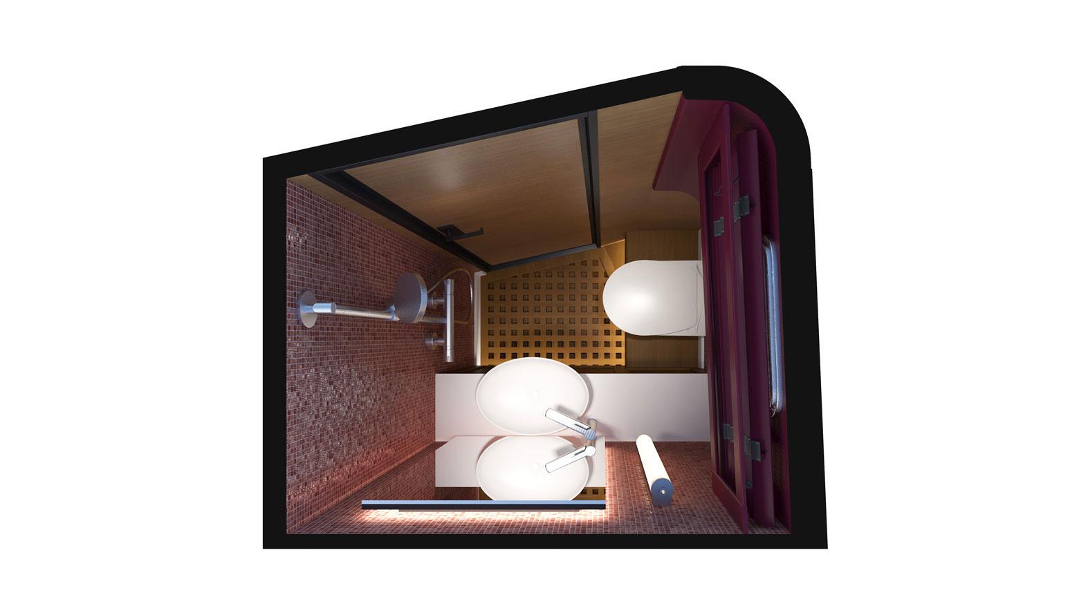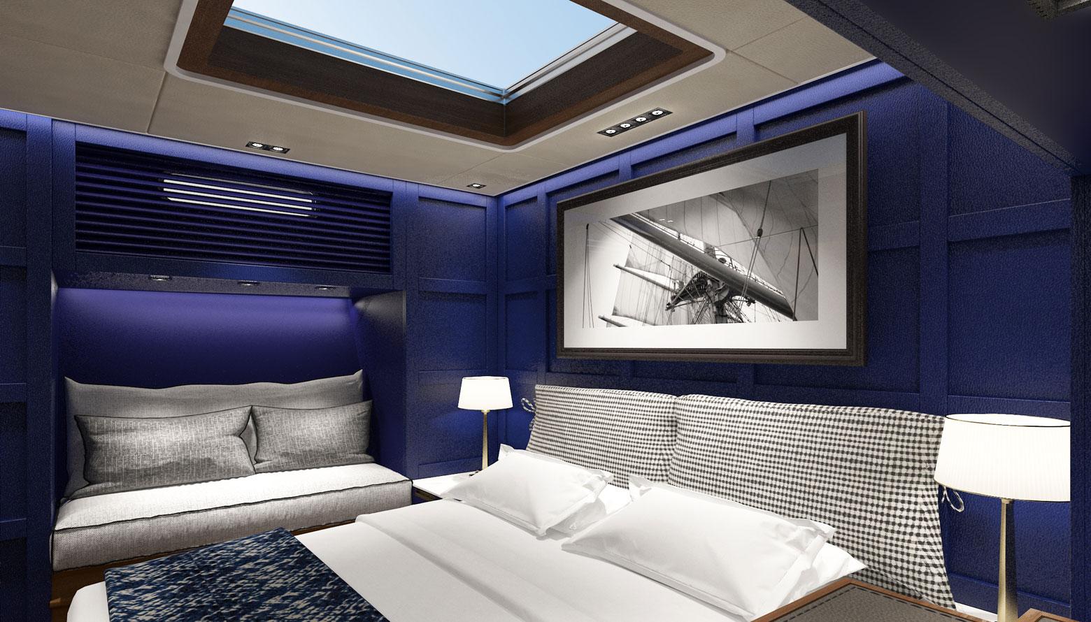 In 2019, we were assigned to design the interior of a traditional/modern-day, new-building sailing yacht. Our proposal was to “dress” each space with bright-colored leather: a different color for each area. For the main lounge we chose a vibrant yellow, for the master bedroom a deep blue-purple, and for the guest cabins a dark red. The leathers will be used to upholster wooden wall panels. For the sanitary areas we proposed glass mosaic tiles of the same colors. We worked very closely with the owners, in order to finalize all the functional details as per their requirements.