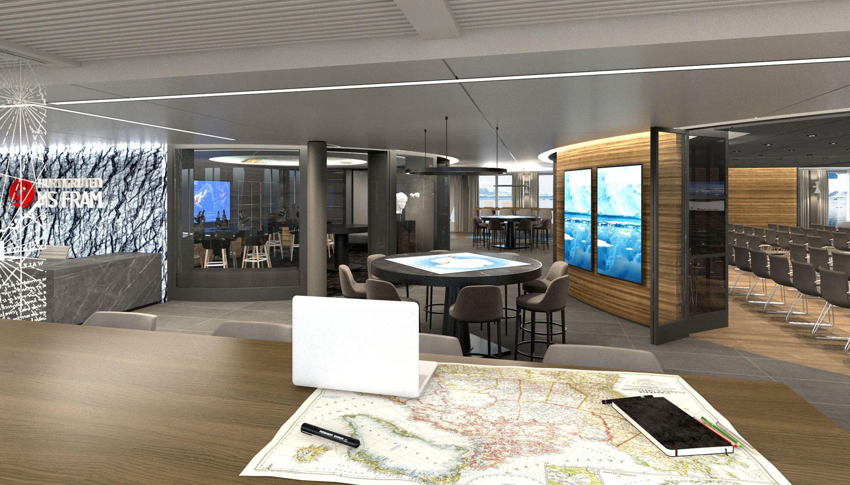 We were introduced to norwegian company Hurtigruten Cruises by Leadship, the naval engineering and consulting group. The project was the renovation of M/S Fram, an ice-class expedition cruise ship that travels in polar regions.